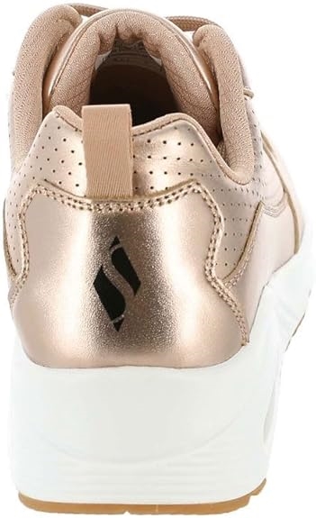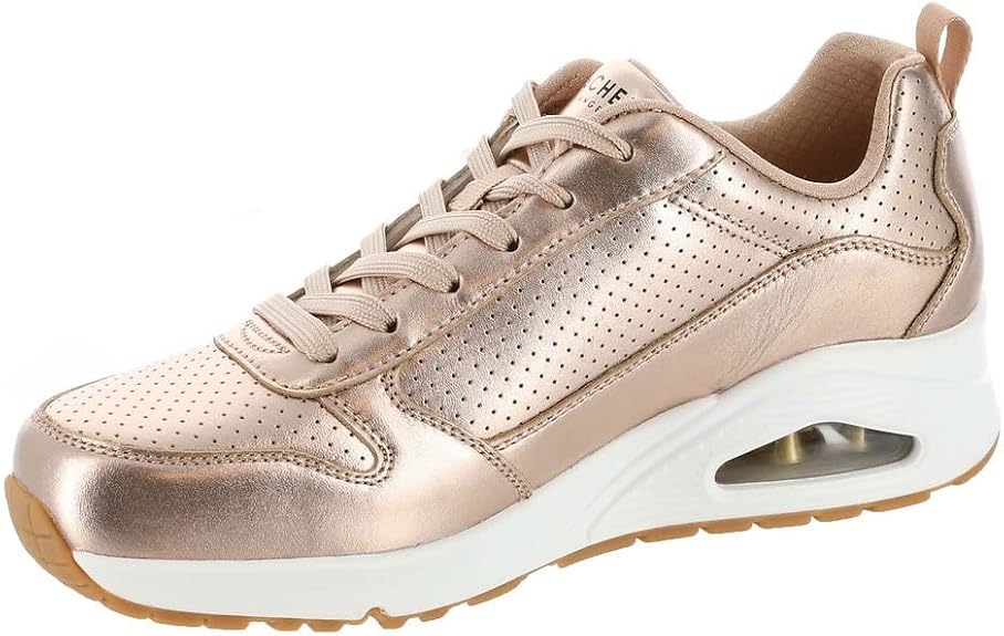 Ces chaussures skeckers 177109 rose métal. Brillez avec le modèle mode confortable Skechers Street™ Uno – Metallixs. Cette sneaker à lacets présente une tige en cuir à la finition métallisée avec une semelle intérieure en mousse à mémoire de forme aérée et une semelle intermédiaire à coussin d’air visible.
